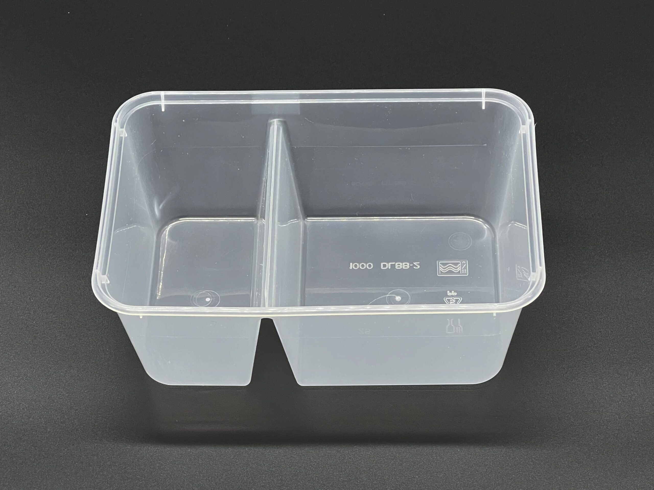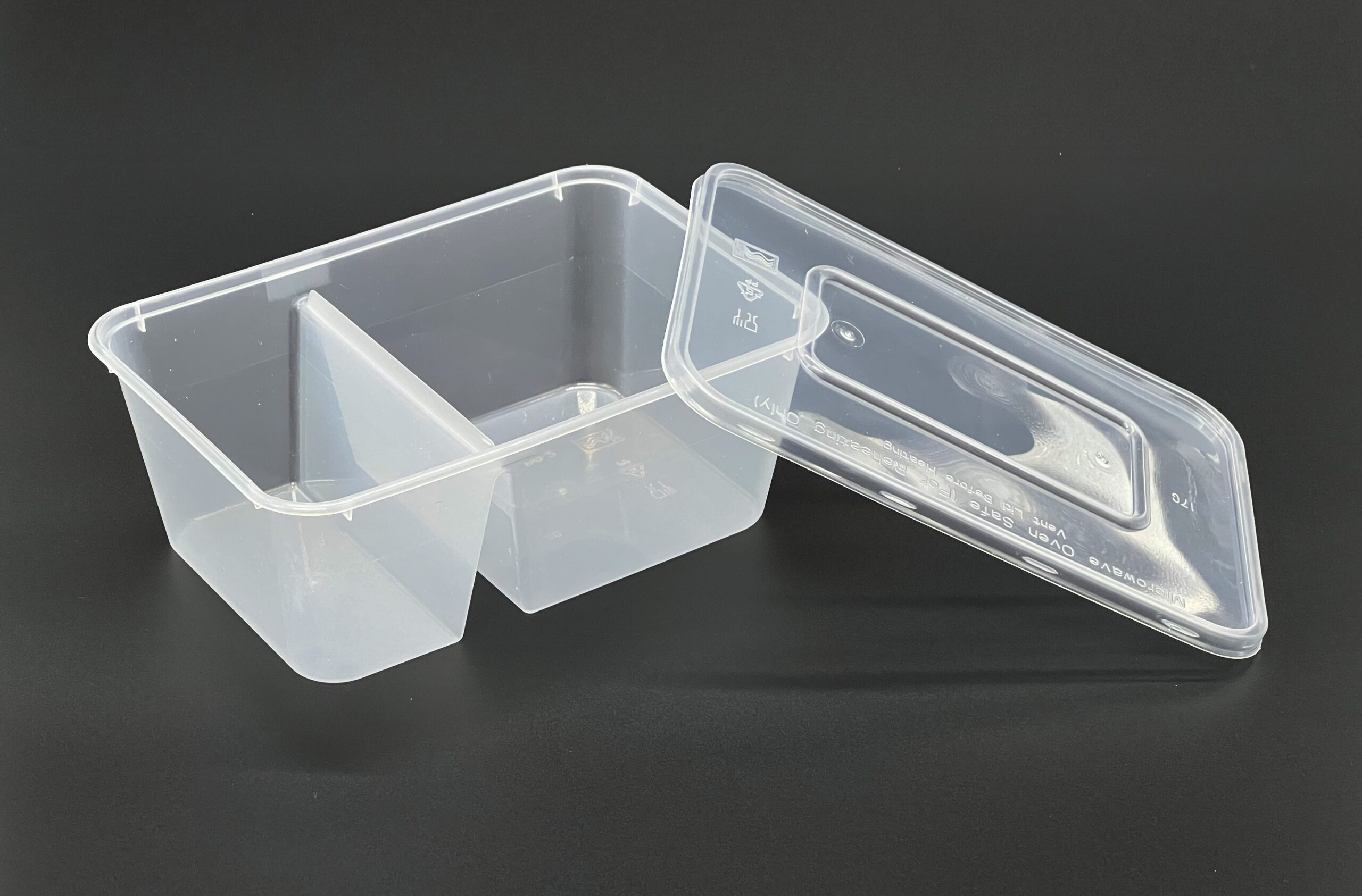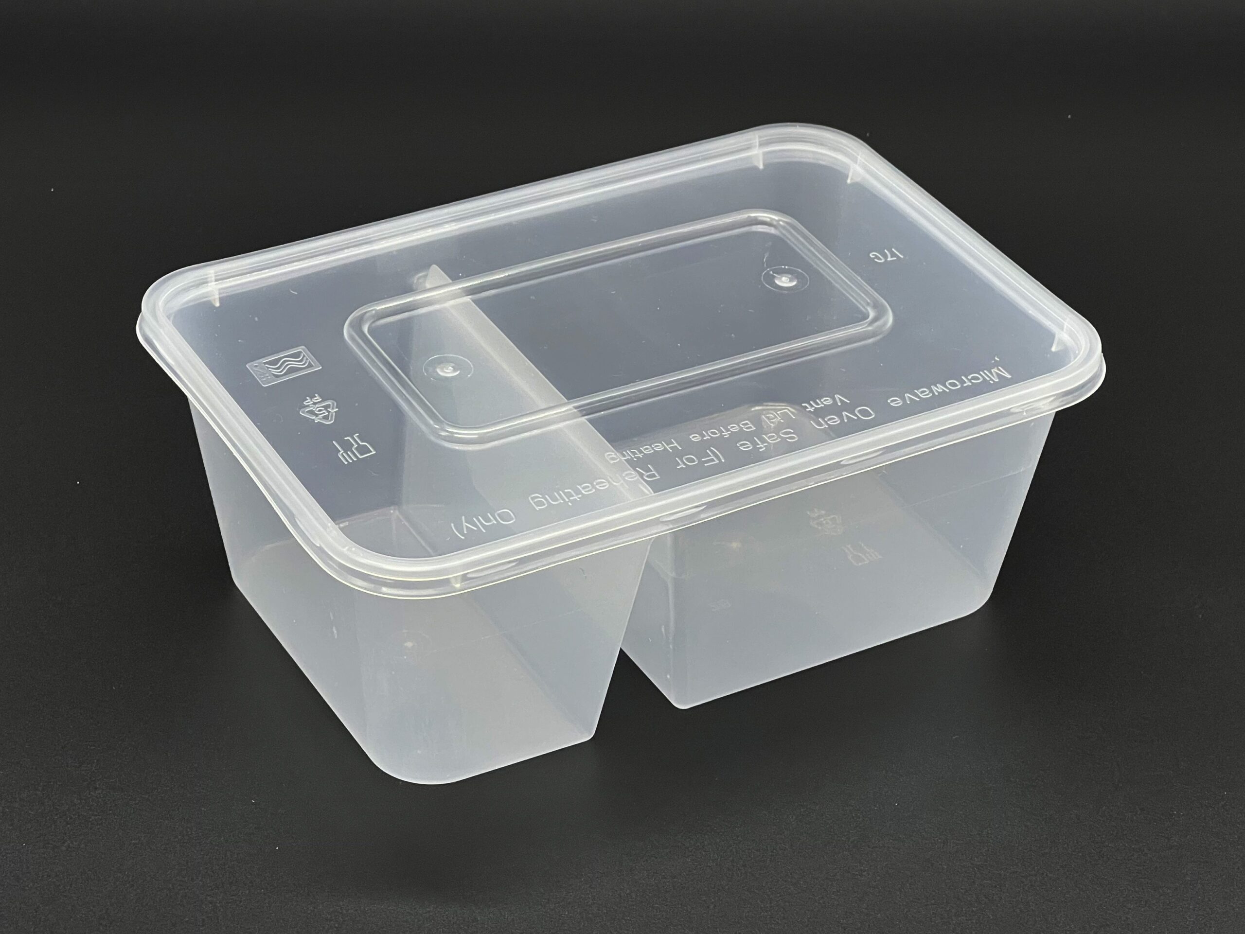Plastic food container with 2 individually separated sections. Great for mixed dishes