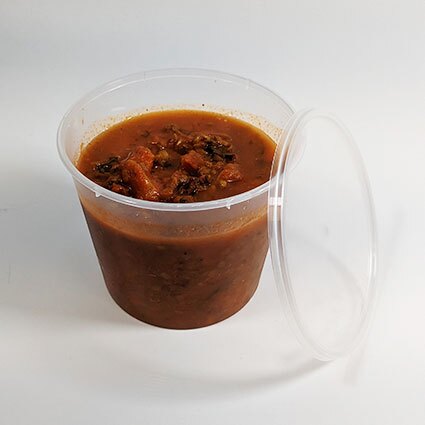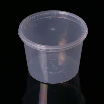 Clear round plastic food container with Lids provided. Commonly used to carry soup/sauces or as a deli pot.