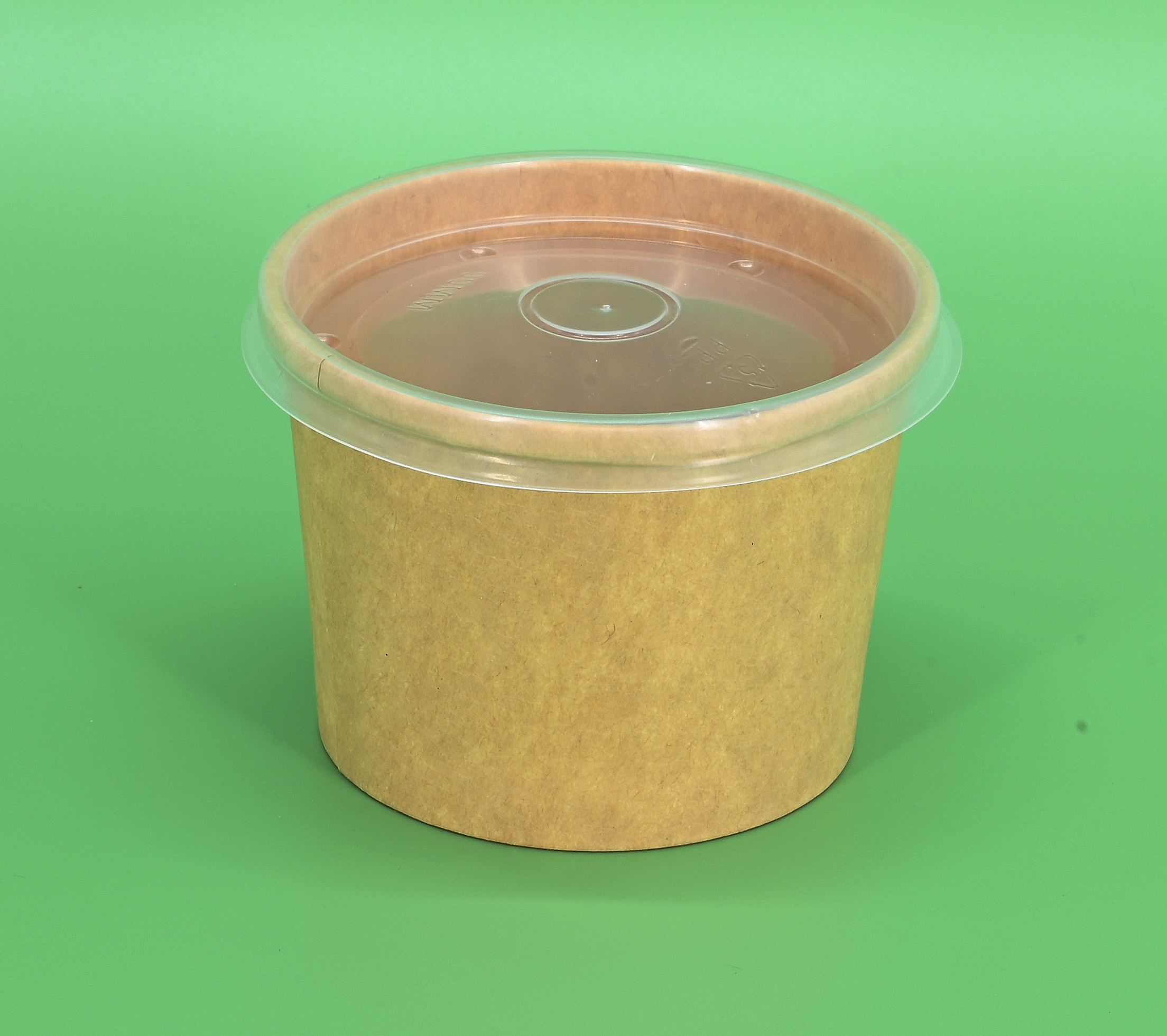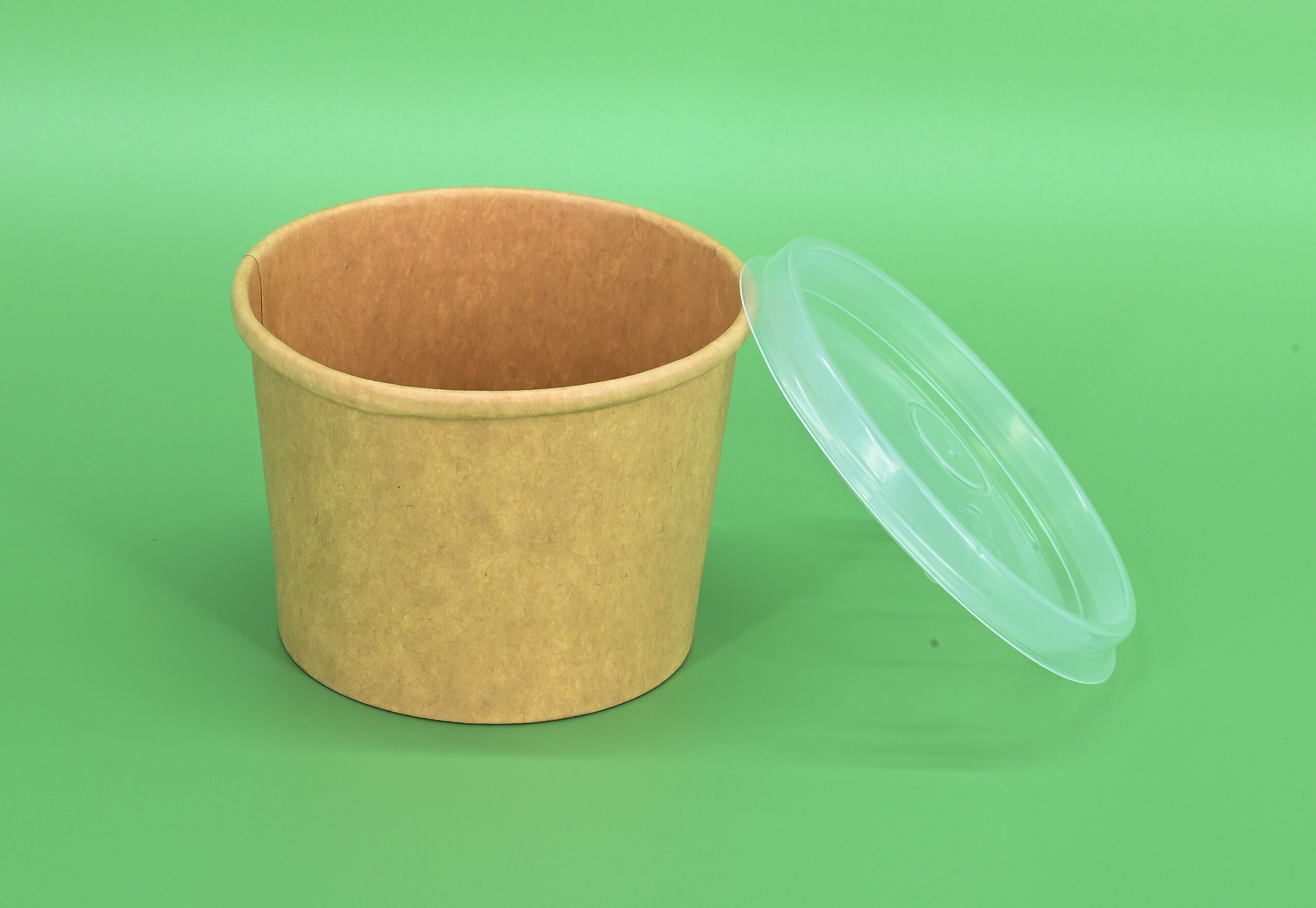 8oz Round Kraft paper container with Lids provided. Commonly used for carrying sauces or salad dressings.