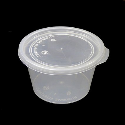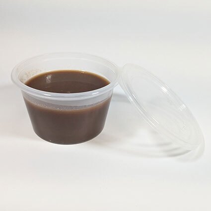 Clear round plastic container commonly used for carrying sauces or condiments.