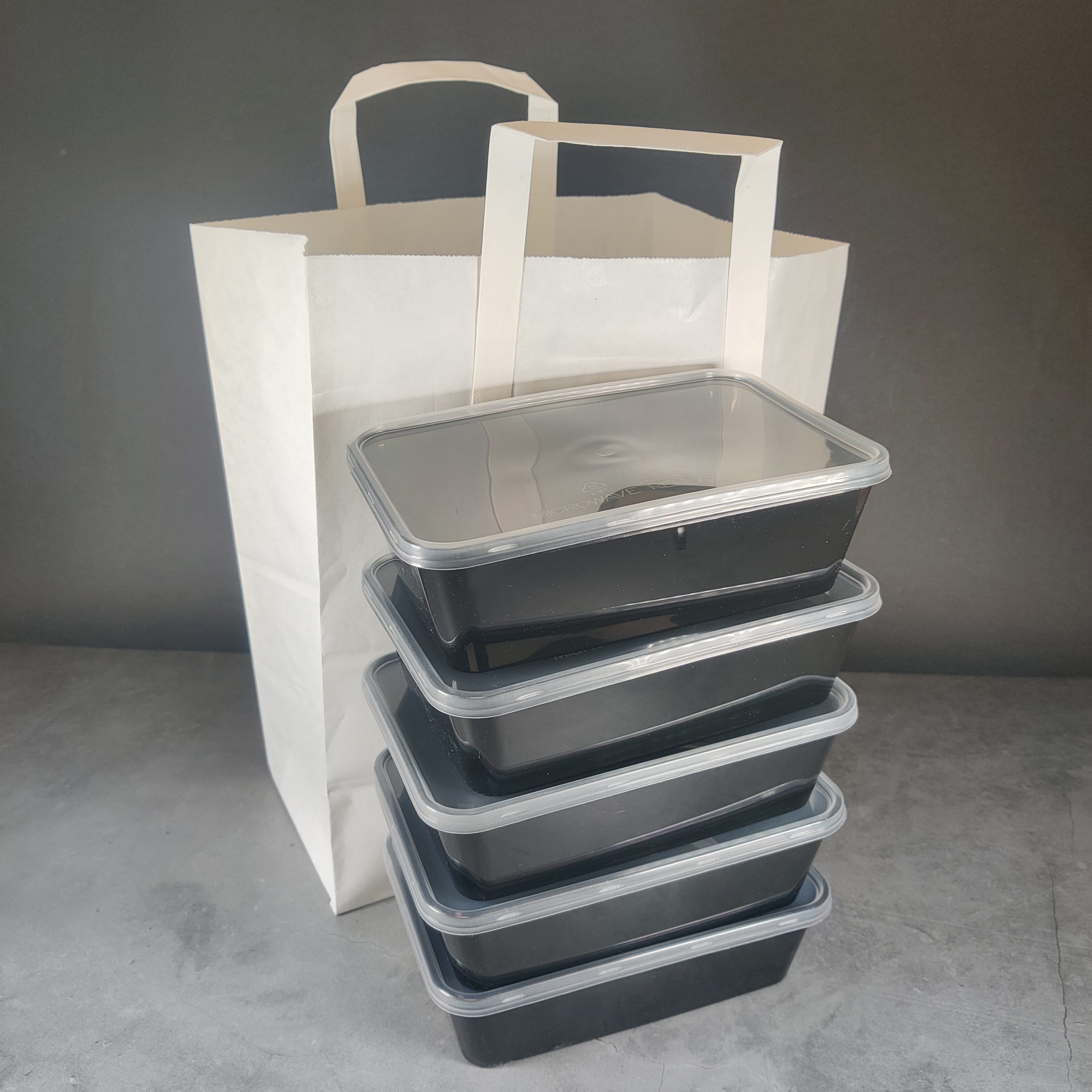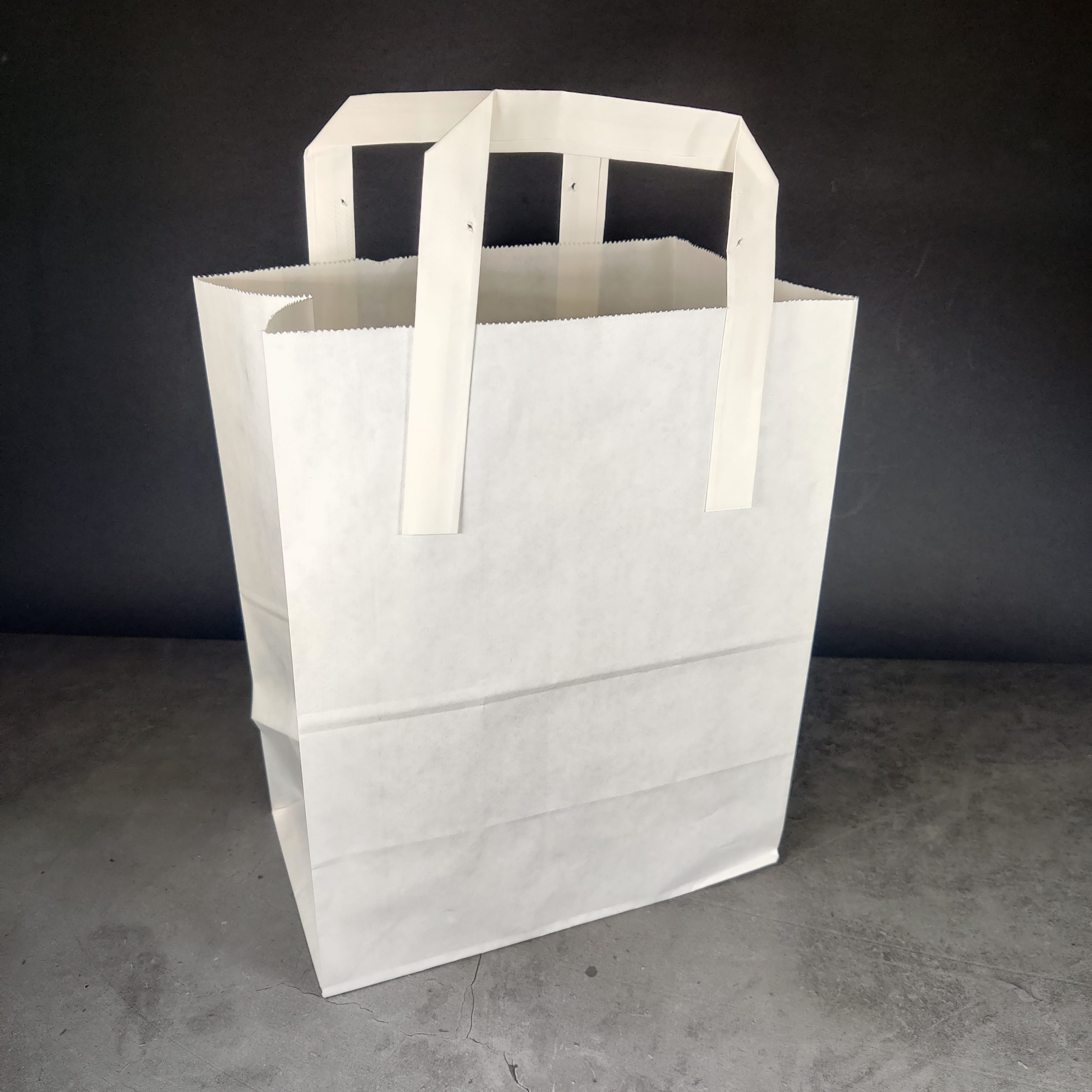 A large sized White handled paper bag / carrier bag. Ideal for takeaways and a great alternative to plastic bags, as they are easily recycled.